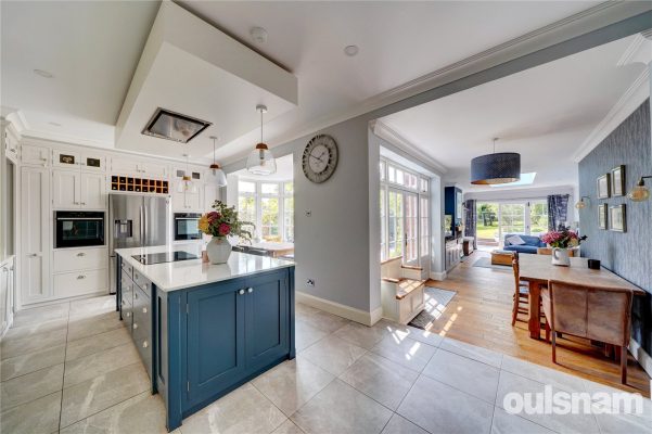 From the breakfast kitchen, an impressive, extended family room offers an ideal entertainment space, with a large roof lantern which floods the space with natural light and bi-fold doors opening onto a further patio area.