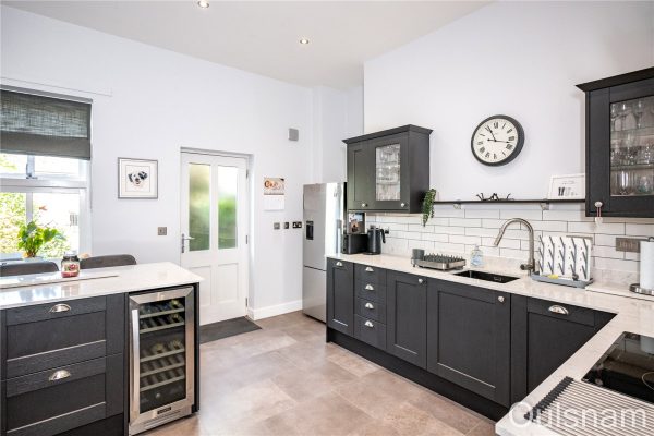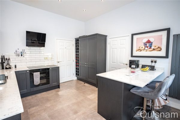 Kitchen/Diner which has a mixture of wall mounted and base units with Quartz worktops over with an inset wash hand basin. There is an integral double oven and grill, an electric hob with an extractor hood above and a wine cooler. There is a window looking out to the rear, a door out to the rear garden and a door to the,