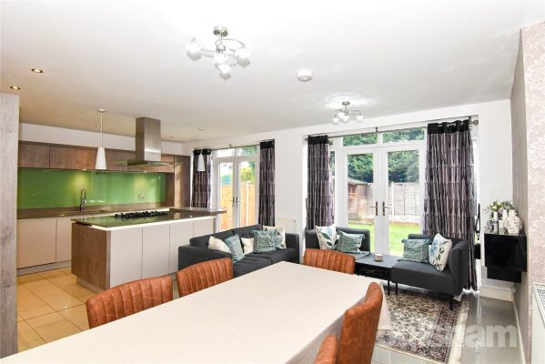 * The spacious kitchen is fitted with a comprehensive range of base cupboards and wall-mounted units, providing ample storage and worktop space. Integrated appliances include a double oven, extractor fan, dishwasher, and washing machine, along with designated space for a fridge freezer, creating a practical and well-equipped cooking environment. Open plan to the kitchen is a bright dining area, enhanced by skylights that flood the space with natural light. Patio doors open directly onto the rear garden, offering an ideal setting for family dining and effortless indoor-outdoor living.
