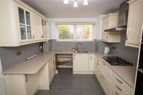 The kitchen is fitted with a range of base and wall units, stainless steel sink unit, working surfaces, wall mounted central heating boiler, plumbing for washing machine, window and door to rear garden.