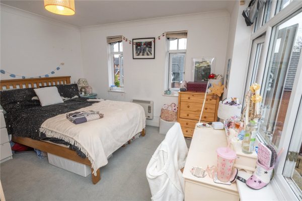 Bedroom one has a feature walk-in bay window to the front, fitted double wardrobe with sliding doors, wood effect flooring and door to the en-suite shower room with white suite.