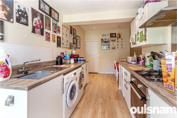 • The kitchen is located to the rear with kitchen units and space for a free-standing cooker.