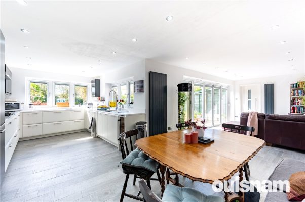 * The centerpiece and beating heart of this home is the open plan dining kitchen with garden room which has under-floor heating and enjoys dual aspect windows that provide views over the rear garden and beyond, making this room an ideal space for entertaining. The garden room boasts five panel bi-fold doors which lead out to the rear garden;