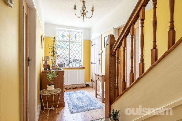 As you step into the welcoming entrance hall, you’re greeted by beautiful oak wood flooring that flows throughout the main living areas. An original style stained glass side window brings colourful light into the space, while a generously sized understairs storage cupboard offers practical storage.