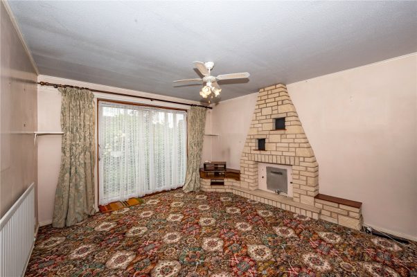 The spacious dining lounge is positioned to the rear of the property. An electric fire with decorative surround provides a focal point, while a door beneath the stairs offers additional storage. Patio doors open directly onto the rear garden, allowing for seamless indoor-outdoor living.
