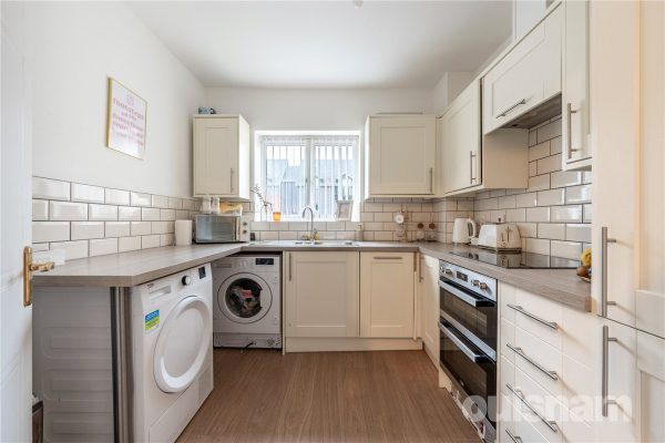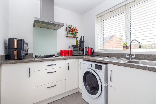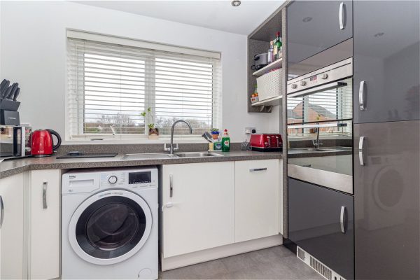 The dual aspect open plan dining-lounge and kitchen, is ideal for modern living. The kitchen area is fitted with an integrated oven, electric hob, and offers space and plumbing for both a washing machine and fridge freezer.
