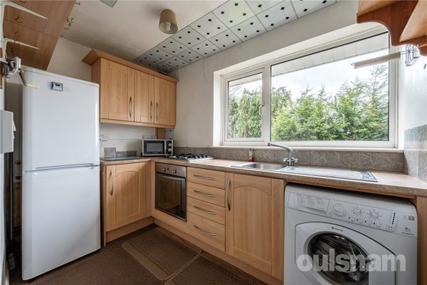 The kitchen is fitted with an integrated oven and gas hob. There is space for a freestanding fridge/freezer and washing machine. A rear-facing window overlooks the garden.