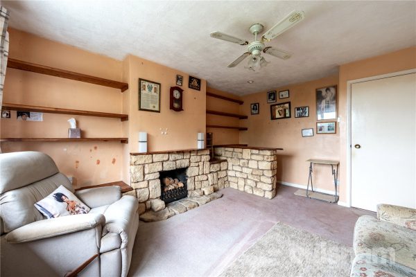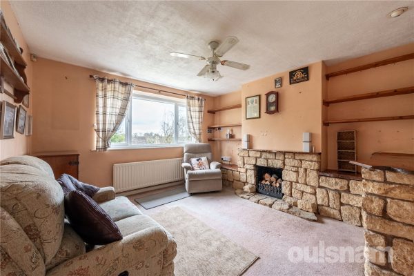 The spacious lounge benefits from a feature stone fireplace as a focal point and a fitted bar area, offering potential for entertaining space. There is a window overlooking the rear.