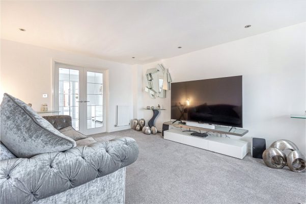 Bedroom two is particularly spacious and is accessed via double folding doors. It enjoys two windows to the rear, allowing for plenty of natural light, and features fitted wardrobes with sliding mirrored doors.