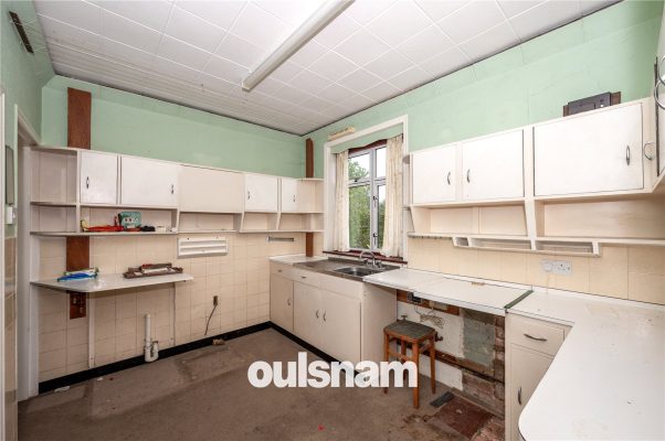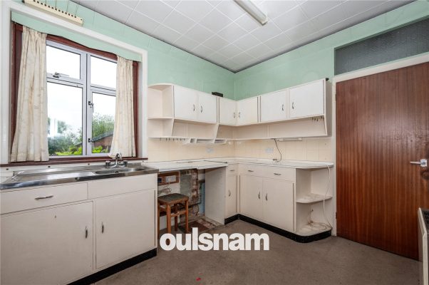 The dining kitchen having a range of wall and base units, space & plumbing for a washing machine, oven, and undercounter fridge. A window overlooks the rear garden and a door leads into the rear porch.