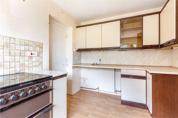 The kitchen is practical, offering ample cupboard and worktop space along with an integrated oven and electric hob.
