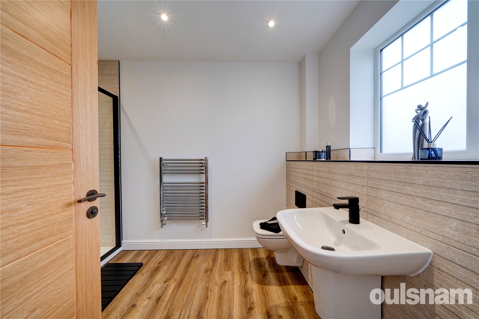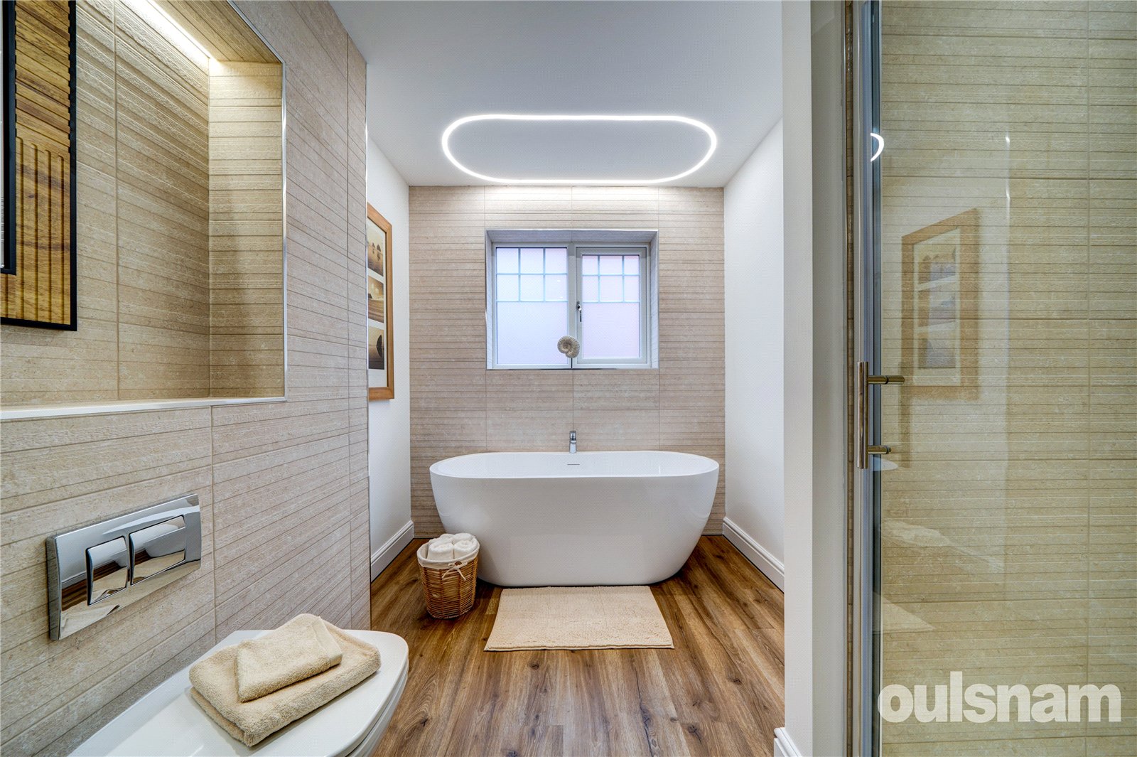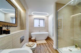 A stylish, modern family bathroom fitted with Vitra sanitary ware and coordinated Porcelanosa tiling, with freestanding bath, shower cubicle, vanity unit with wall hung wash hand basin and wall hung wc, heated towel rail and double glazed window to the side.