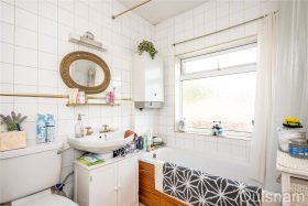 Bathroom which has a bath with a timber panel and a shower above, a low level toilet, a wash hand basin and a window looking out to the rear of the property