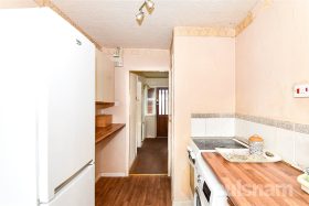 * The kitchen is fitted with a range of base cupboards and incorporates a breakfast bar area. There is space for a fridge freezer and cooker, along with plumbing for a washing machine. A door provides direct access to the rear garden.