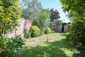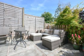 * A well kept landscaped rear garden with patio area, secure gated side access and steps leading down to an established lawn with mature shrubbery