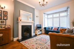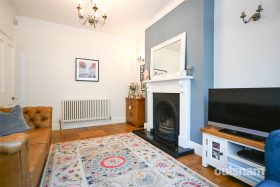 * Two reception rooms; front room having bay window with shutter blinds, period style coving and a feature fireplace