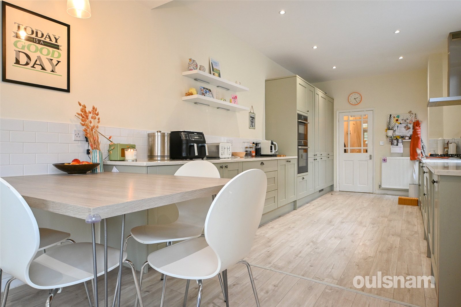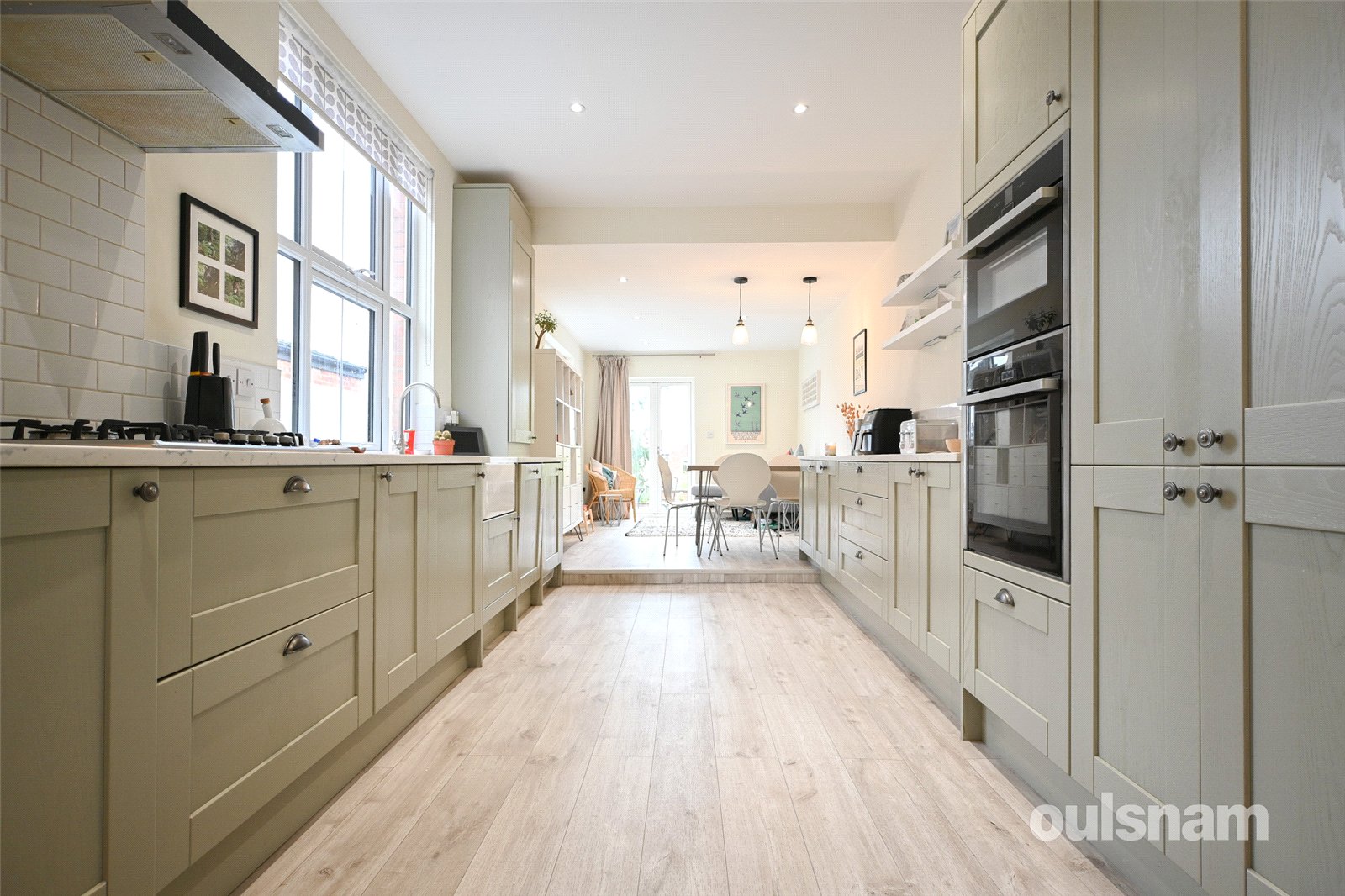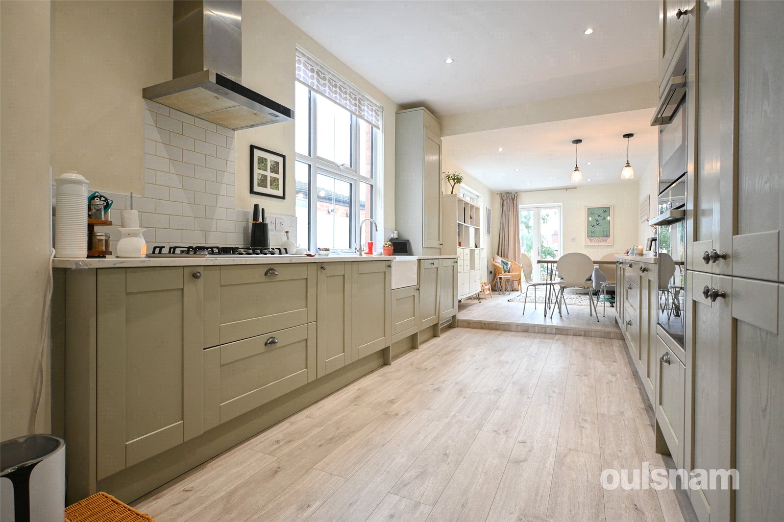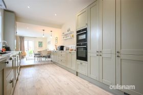 * A stunning, extended Shaker-style kitchen diner with split levels. The kitchen is complete with integral appliances to include fridge/freezer, eye level oven and grill, five ring gas hob and a dishwasher