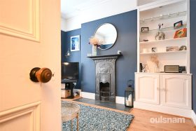 * The through lounge features a cast iron open fire place, picture rail, coving, ceiling rose and bespoke storage with shelving