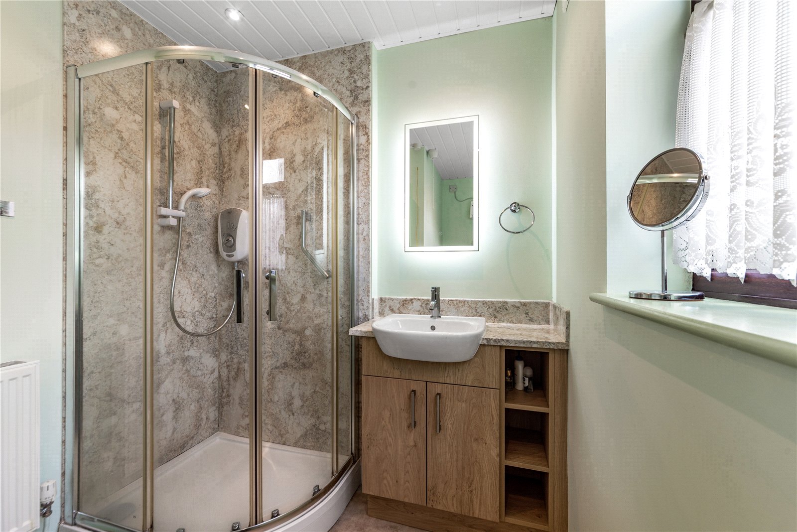 An inner hall provides access to the rear garden and leads to the ground floor bathroom, which is fitted with a corner shower cubicle, vanity unit housing the wash hand basin, and a low-level enclosed dual flush WC.