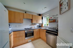 * Contemporary style kitchen fitted with wall and base units incorporating a four ring gas hob with oven below, space for a washing machine, dishwasher, fridge and freezer, and a sink overlooks the front aspect
