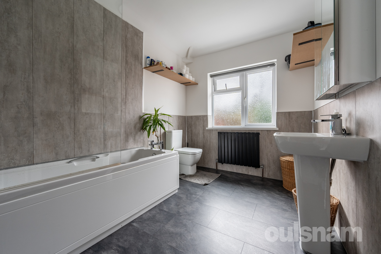 *Large family bathroom comprising of panelled bath with over shower fitment, wash hand basin and low-level WC.