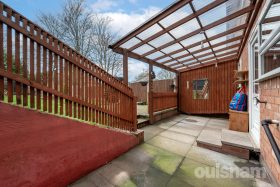*Rear garden with covered patio area, lawned garden with fenced borders, shed and additional covered storage space, and side access to frontage.