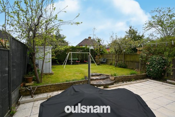 * REAR GARDEN HAVING PAVED PATIO AREA LEADING TO LAWN, HEDGING TO BORDERS, TIMBER FENCES AND GATE LEADING TO REAR ACCESS.