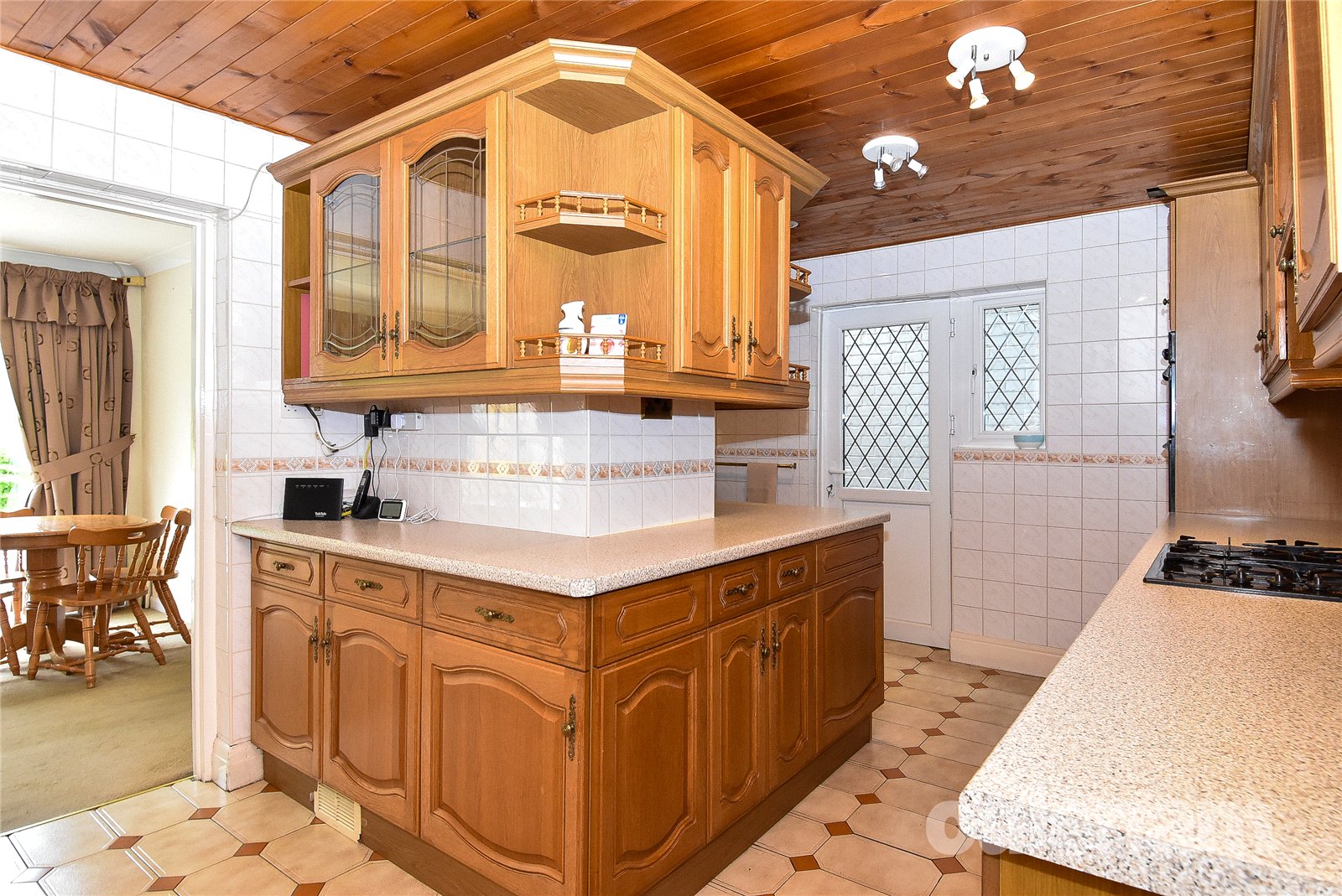 * The kitchen is well-equipped and functional, offering a generous amount of counter space for food preparation and storage. It features an integrated gas oven and hob, along with a dual tap sink and drainer set beneath a window. The kitchen also benefits a door providing access to a lean-to, adding useful additional space for storage and providing access to the garage.