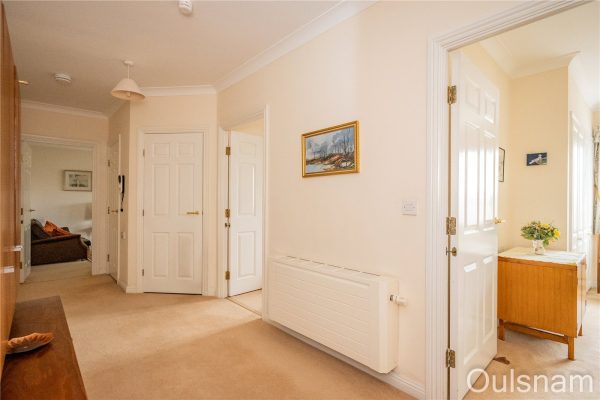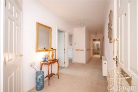 Entrance hallway having access to two storage cupboards and doors radiating off to