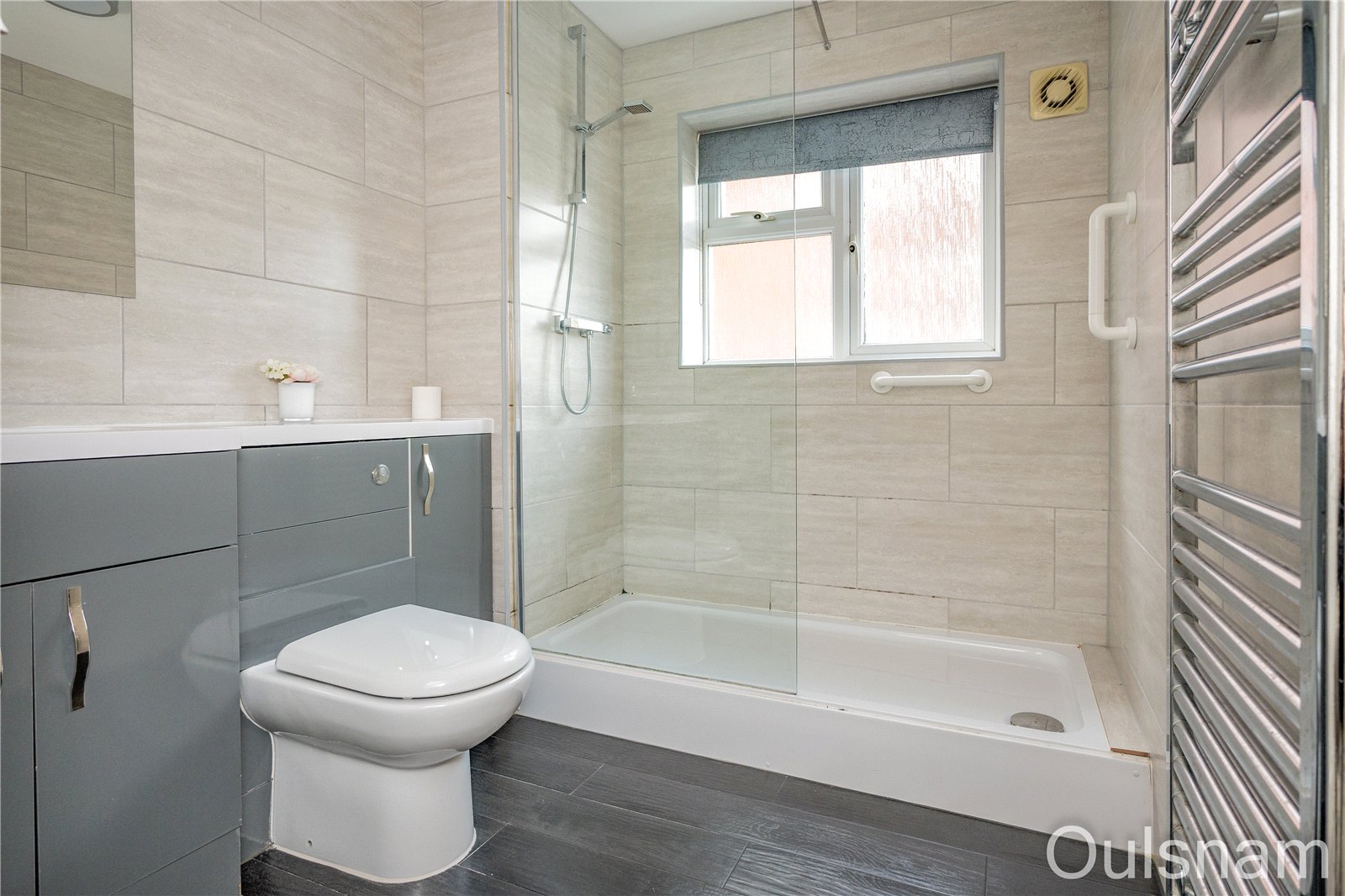 * Shower room which has vanity unit with built-in storage and an inset wash hand basin and a low level toilet. There is a double shower cubicle and a window looking out to the side
