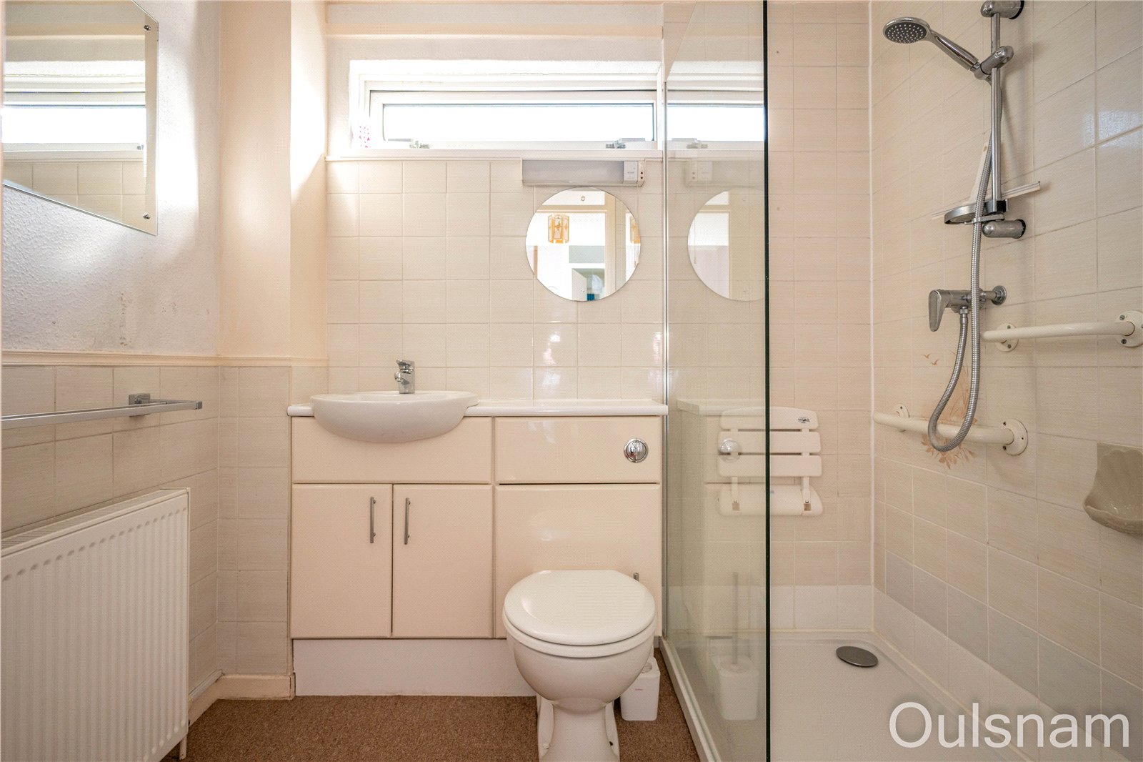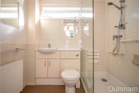 Shower room which has a walk-in double shower, a vanity unit with storage and an inset wash hand basin and low level toilet and a window looking out to the rear.