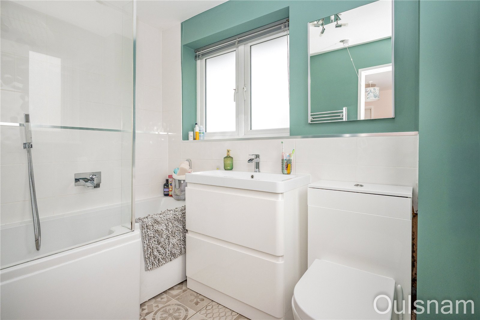 Bathroom which has a bath with a shower, a vanity unit with storage and an inset wash hand basin, a low level toilet and windows looking out to the side and rear.