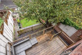 Rear garden which is tiered with a decked area, a gravelled space and a turfed lawn.