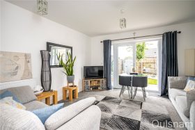* Living room which has a door to a storage cupboard, windows looking out to the rear and French doors out to the rear garden