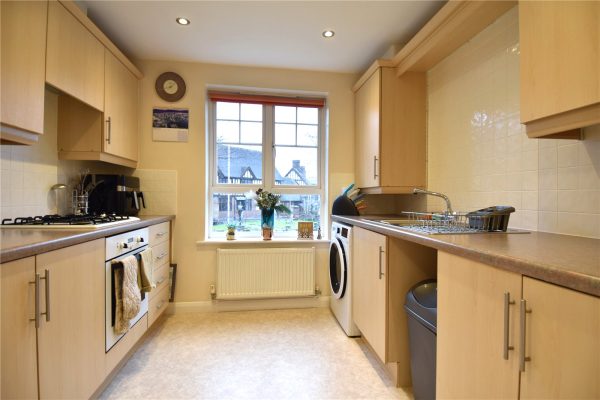 * Kitchen which has a mixture of wall mounted and base units with work tops over and an inset stainless steel sink drainer. There is an integral electric oven, electric hob, extractor hood, washing machine and fridge/freezer. There is a window looking out to the side