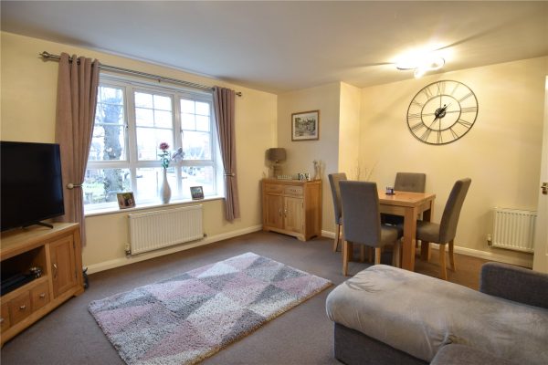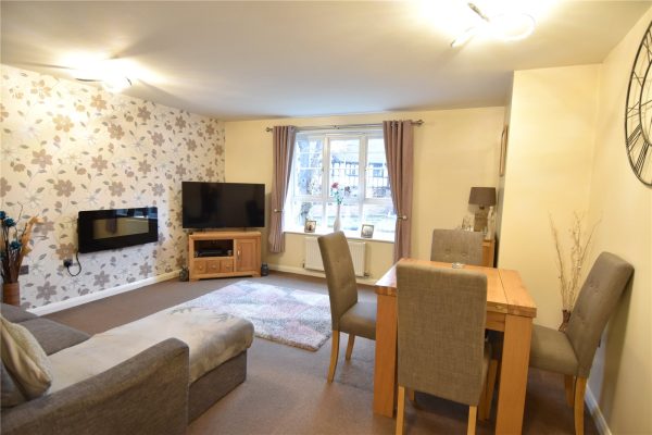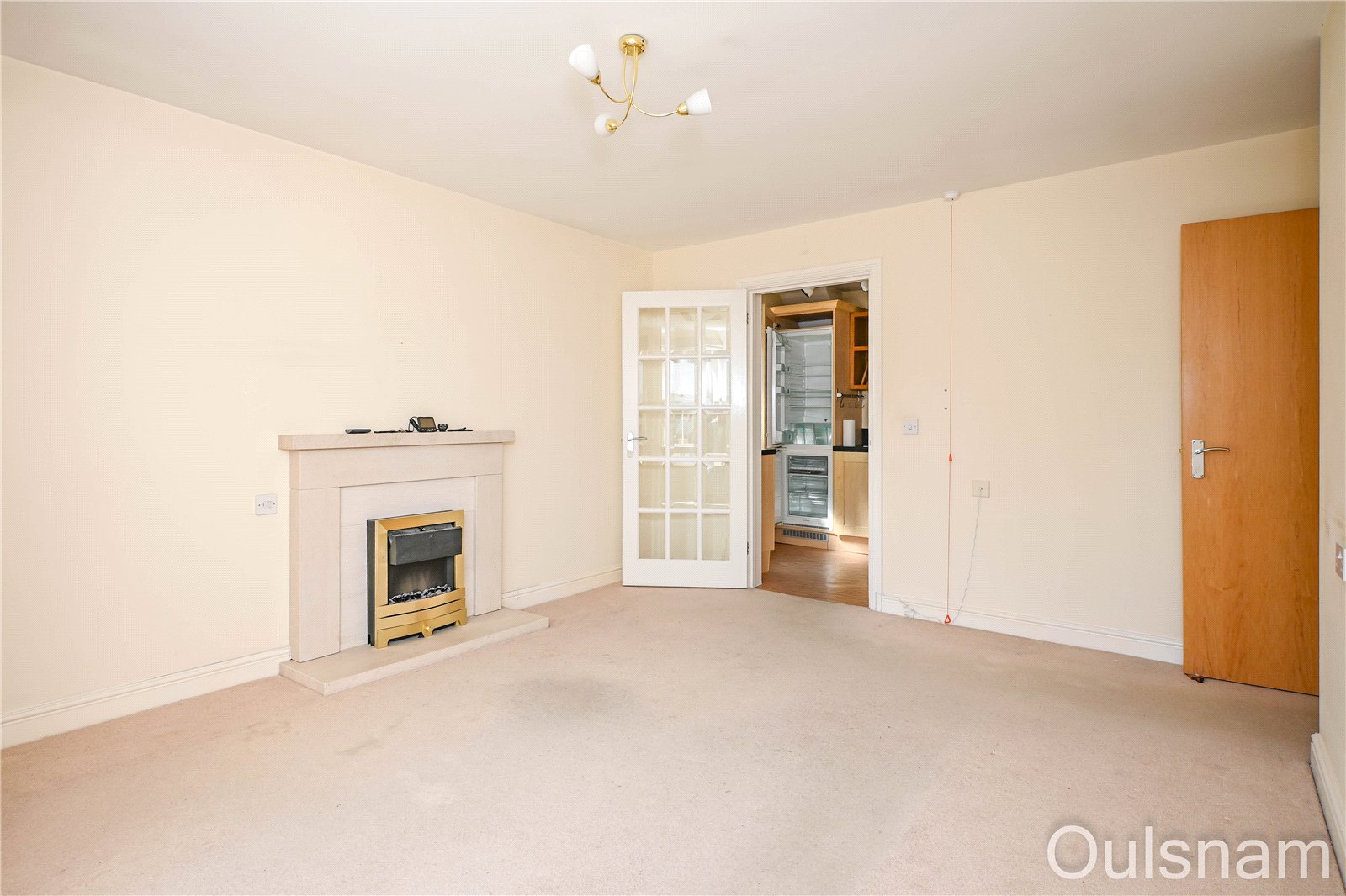 * Living room which has two windows looking out to the front, a feature fireplace with an inset electric fire and a door into the