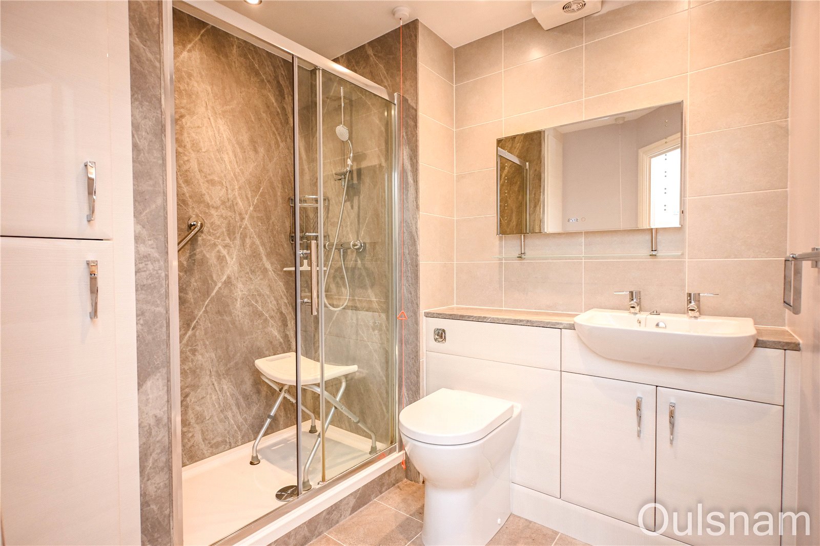 * Shower room which has a walk-in double shower, a storage cupboard and a vanity unit with storage and an inset wash hand basin and low level toilet