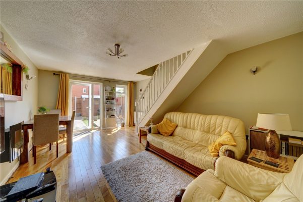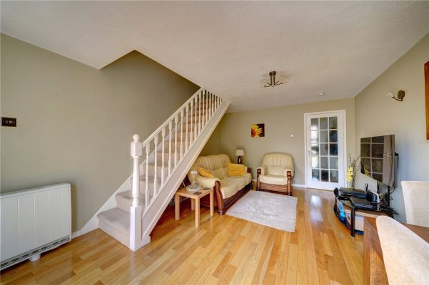 * Living room which has a feature fireplace with an inset electric fire, a window looking out to the front and French doors opening out to