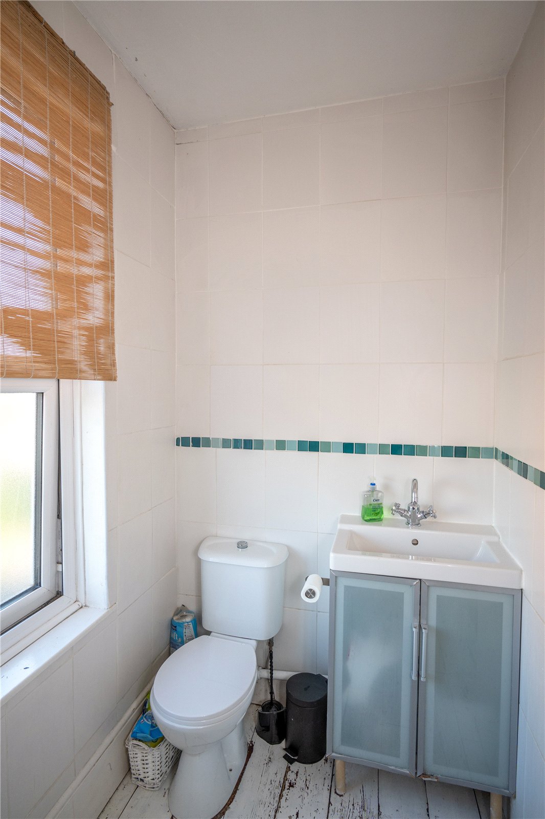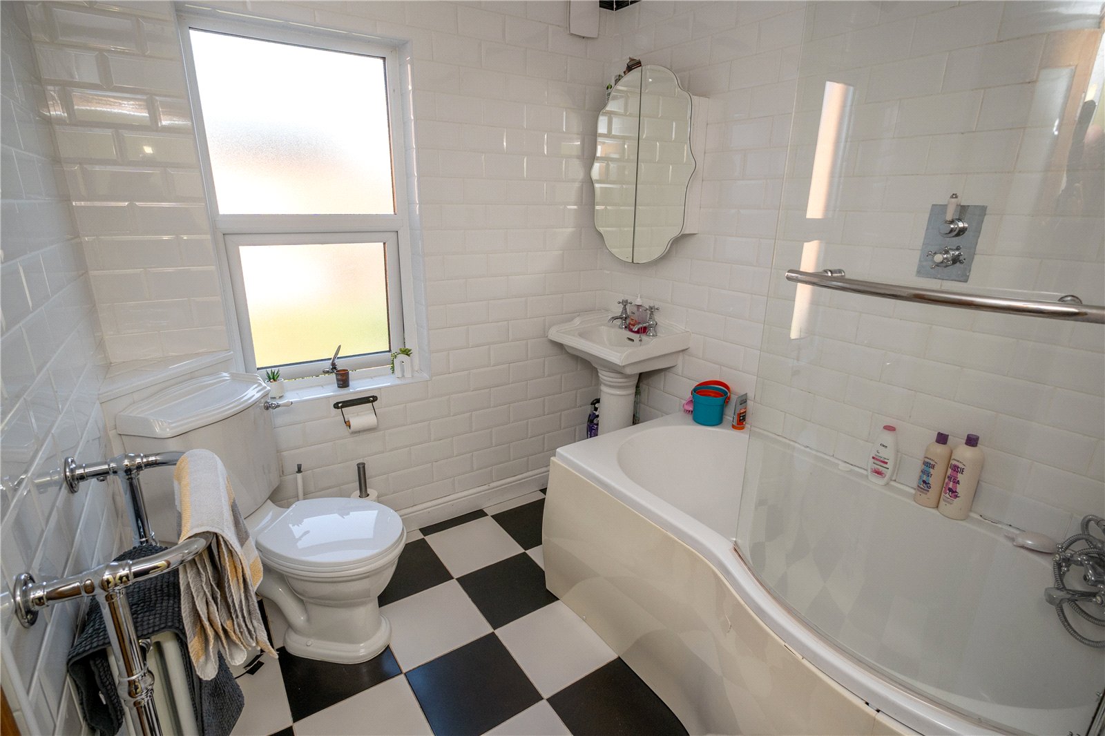 The fully tiled bathroom has a white suite comprising shaped panelled bath with shower over, pedestal wash hand basin, low level w.c. and chrome heated towel rail/radiator.