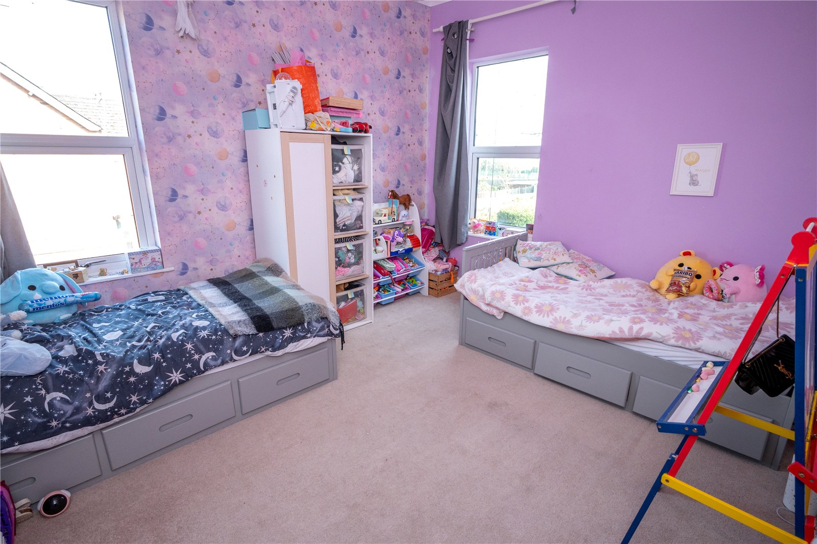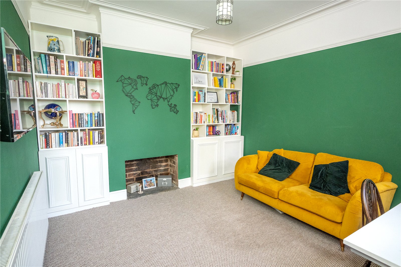 The rear reception room has ceiling cornicing, picture rails and chimney breast with recess flanked by two fitted storage cabinets with open display/book shelving over.