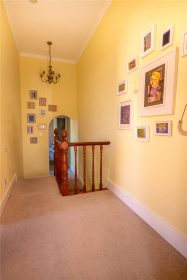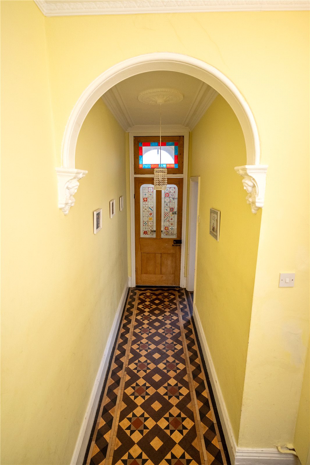 Set back from the road behind a tarmacadam driveway providing off road parking for two cars and giving access to the gated side entry and solid panelled entrance door with arched top light over to the entrance vestibule. A part glazed panelled inner door leads to the reception hall with original Minton tiled floor, stairs to the first floor, deep ceiling cornicing, feature archway with plaster finials, panelled door to original storage cupboard and stripped panelled doors to all three receptions and utility.