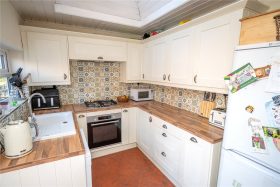 The kitchen is fitted with a range of panelled base and drawer units with inset sink unit, matching wall units, inset stainless steel oven and gas hob with concealed extractor fan above, spaces for dishwasher & fridge/freezer, tiled splash backs, quarry tiled floor and vaulted panelled ceiling with inset skylight.