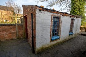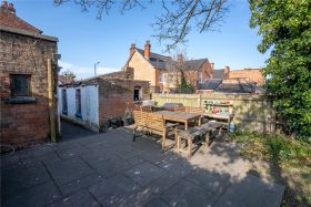 The blue brick yard leads to a detached brick built workshop/garden store, two further garden stores and paved seating area with extensive lawn with mature trees and flowering shrubs and children’s play area.