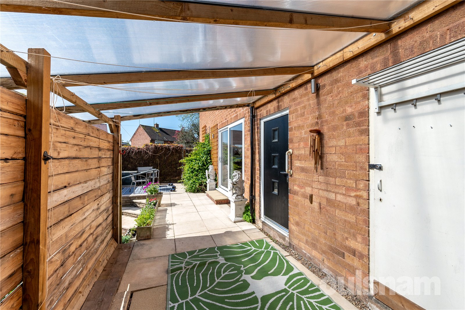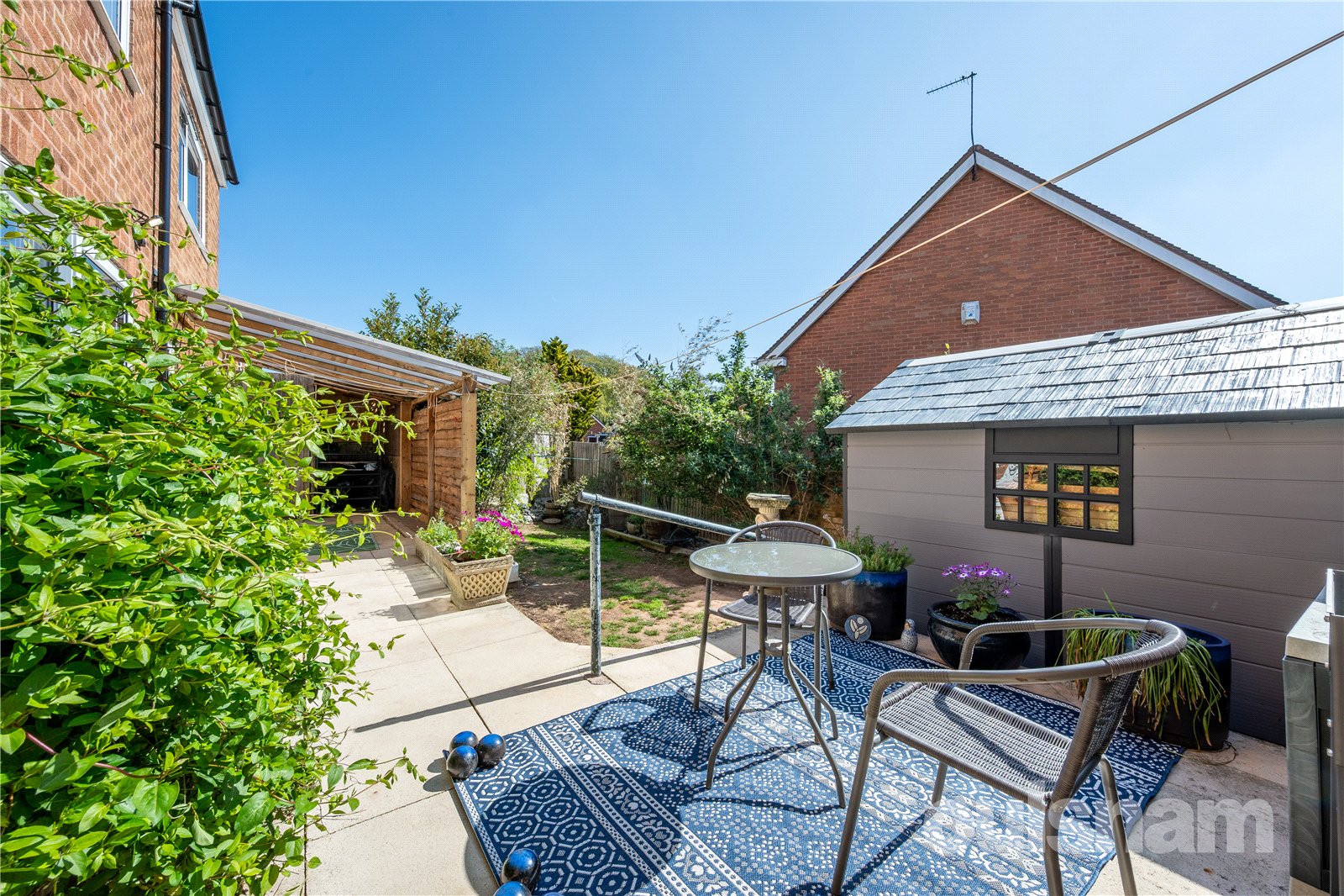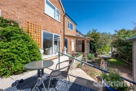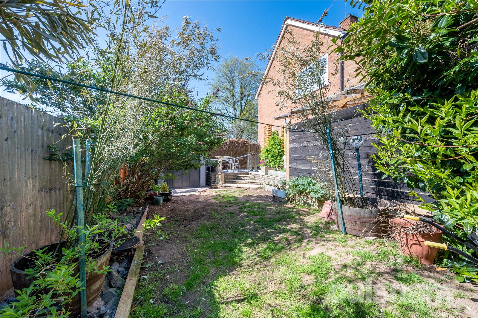 * Low maintenance rear garden with patio area and steps down to the lawn, flower beds and lockable storage
