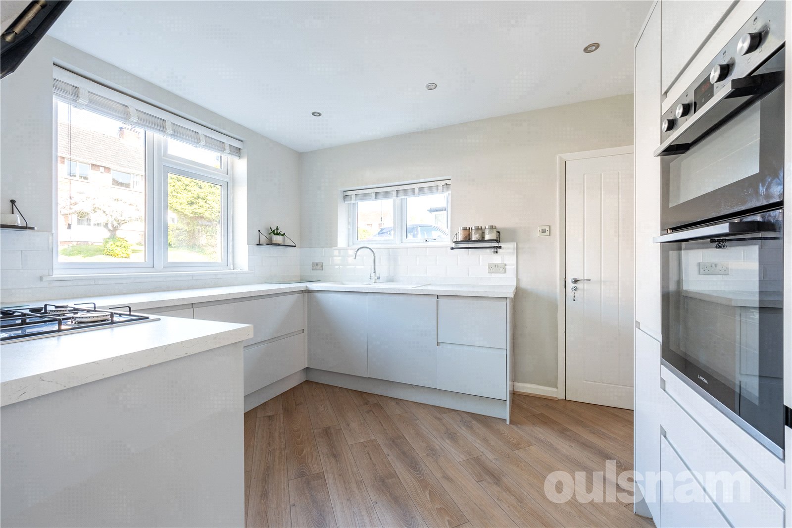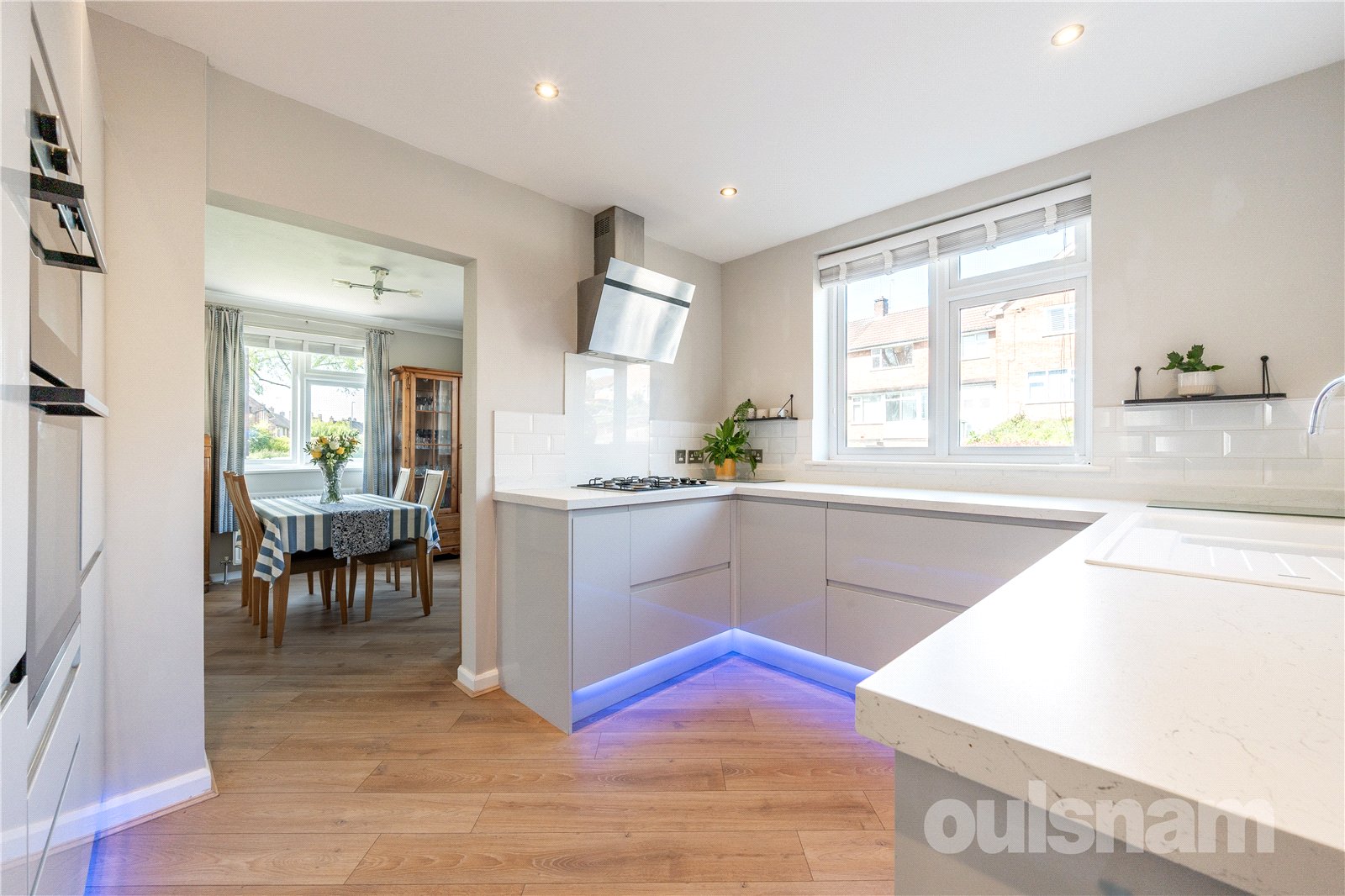 * Contemporary style kitchen with fitted blinds, one and a half bowl sink unit and mixer tap, a range of base units and drawers, four ring gas hob and extractor, eye level oven and grill, integrated refrigerator and dishwasher