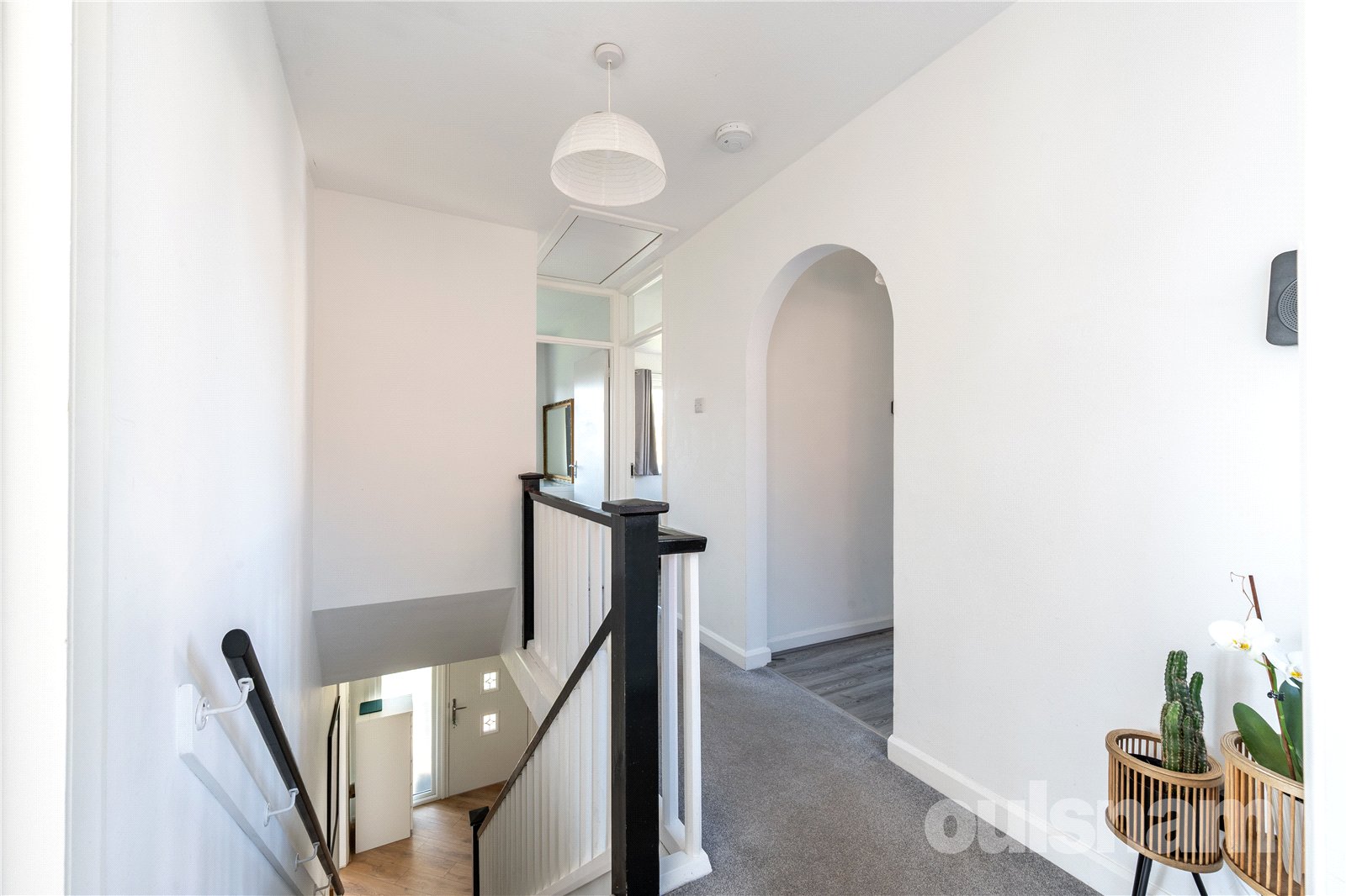* Archway leading to the bathroom which comprises of: a panelled bath, enclosed shower cubicle with shower fitment, wash hand basin and wall mounted mirrored cabinet, separate WC off landing