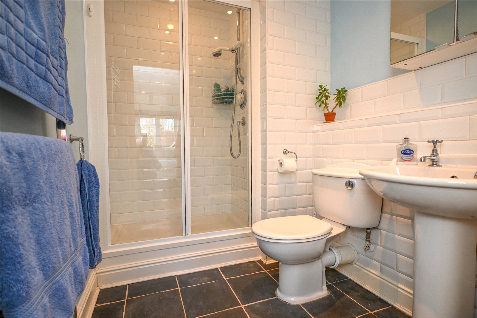 Bedroom one has range of fitted wardrobes and a door to the spacious en-suite shower room with white suite comprising double shower cubicle, pedestal wash hand basin and low level w.c., tiled splash backs & cosmetic ledge and chrome radiator.