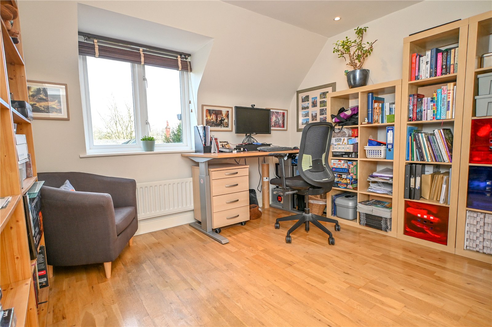 The second double bedroom, currently used as an office has a fitted double wardrobe and the bathroom has a white suite and chrome radiator.