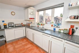 The kitchen is fitted with a range of panelled base and drawer units with inset stainless steel sink unit, matching wall units and open display/storage shelving, integrated stainless steel oven and four ring gas hob with extractor fan above, integrated fridge/freezer, washing machine & dishwasher, wall mounted cabinet housing the gas central heating boiler, tiled splash backs & tiled floor.