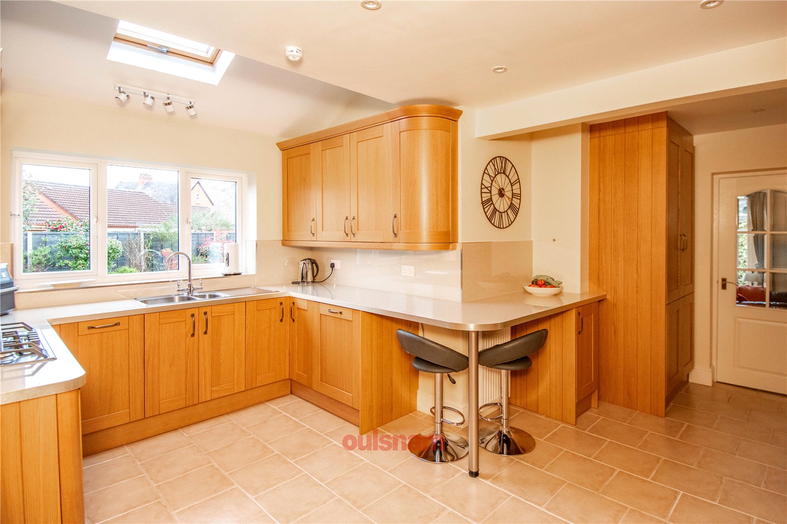 * Kitchen which has wall mounted and base units with worktops over and an inset stainless steel sink drainer. There are a variety of integral appliances including a five burner gas hob, an extractor hood, a double electric oven and grill, a microwave, warming drawer, a full size fridge and separate freezer and a dishwasher. There is a window looking out to the rear, a "Velux" style skylight and doors to the through lounge and entrance hall